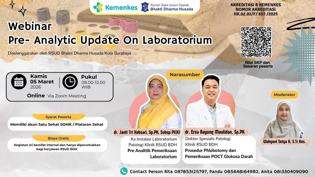Webinar ini diselenggarakan oleh RSUD Bhakti sebagai upaya meningkatkan pemahaman dan kompetensi tenaga kesehatan dalam mencegah medication error serta memperkuat budaya keselamatan pasien. Kegiatan ini akan membahas strategi praktis, peran tenaga kesehatan, dan penerapan standar keselamatan dalam proses penggunaan obat. Webinar berskala nasional ini diharapkan dapat menjadi sarana edukasi dan berbagi pengalaman guna meningkatkan mutu pelayanan kesehatan di fasilitas pelayanan kesehatan seluruh Indonesia.